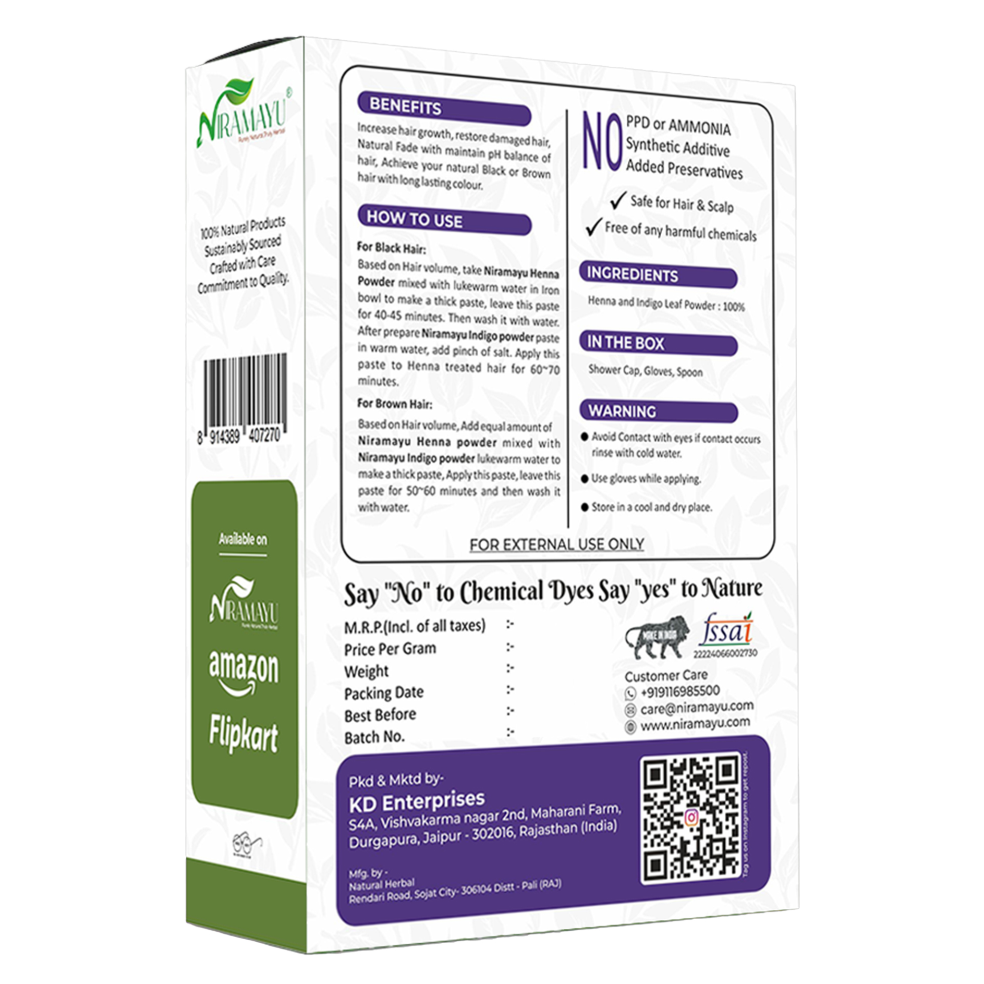 Natural Black Hair Dye Without Chemicals – When used together, henna followed by indigo gives a rich, deep black hair colour naturally. Free from ammonia, PPD, and other harsh dyes, this combo is safe for regular use and suitable for all hair types.