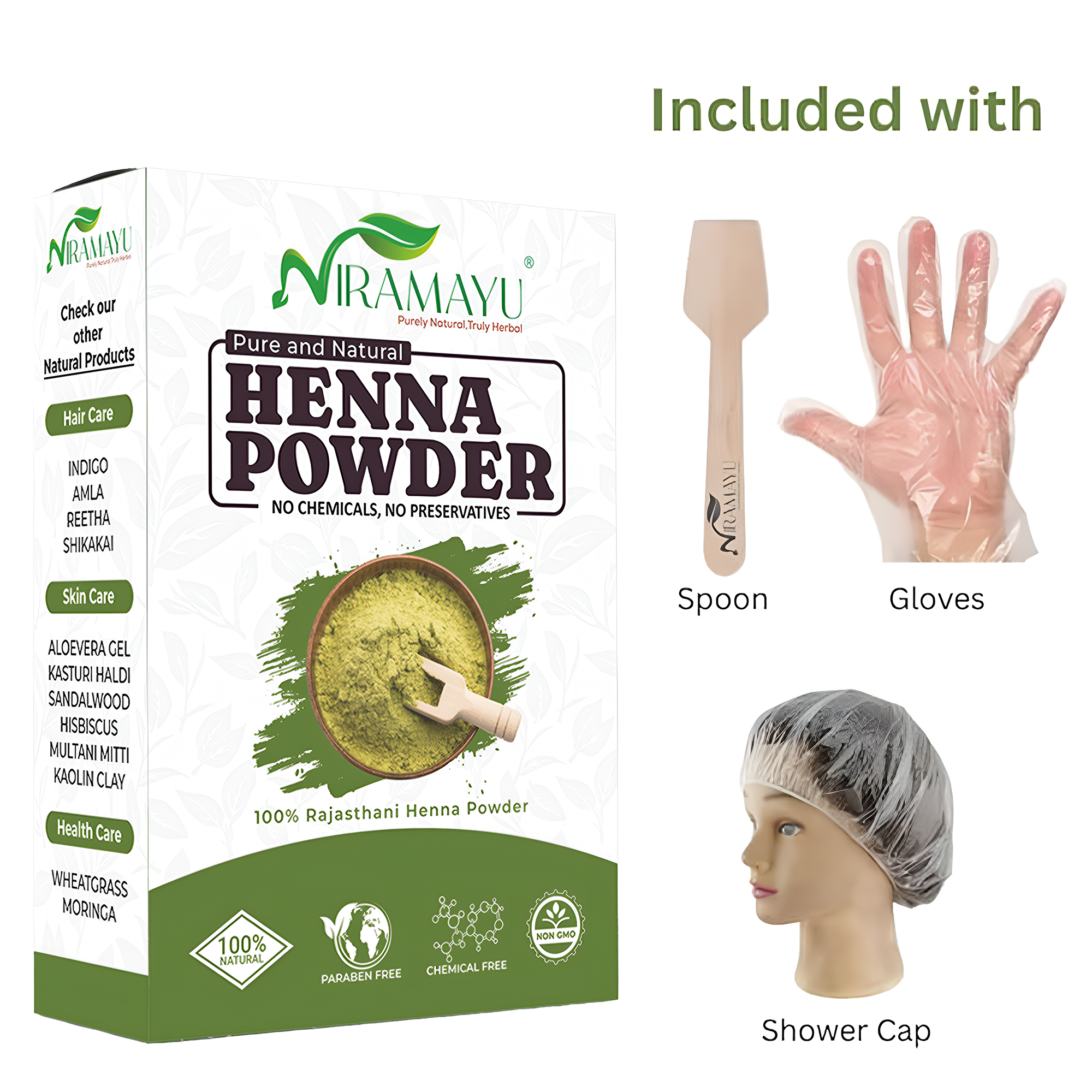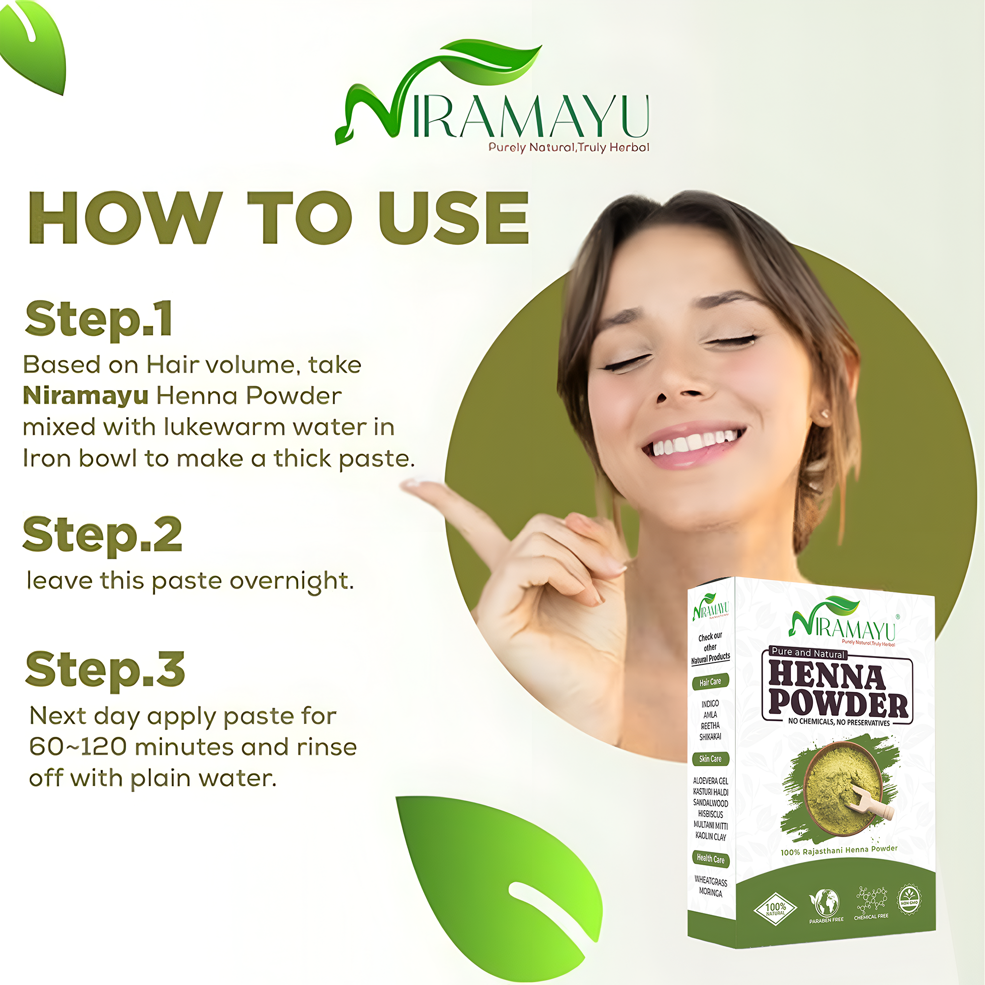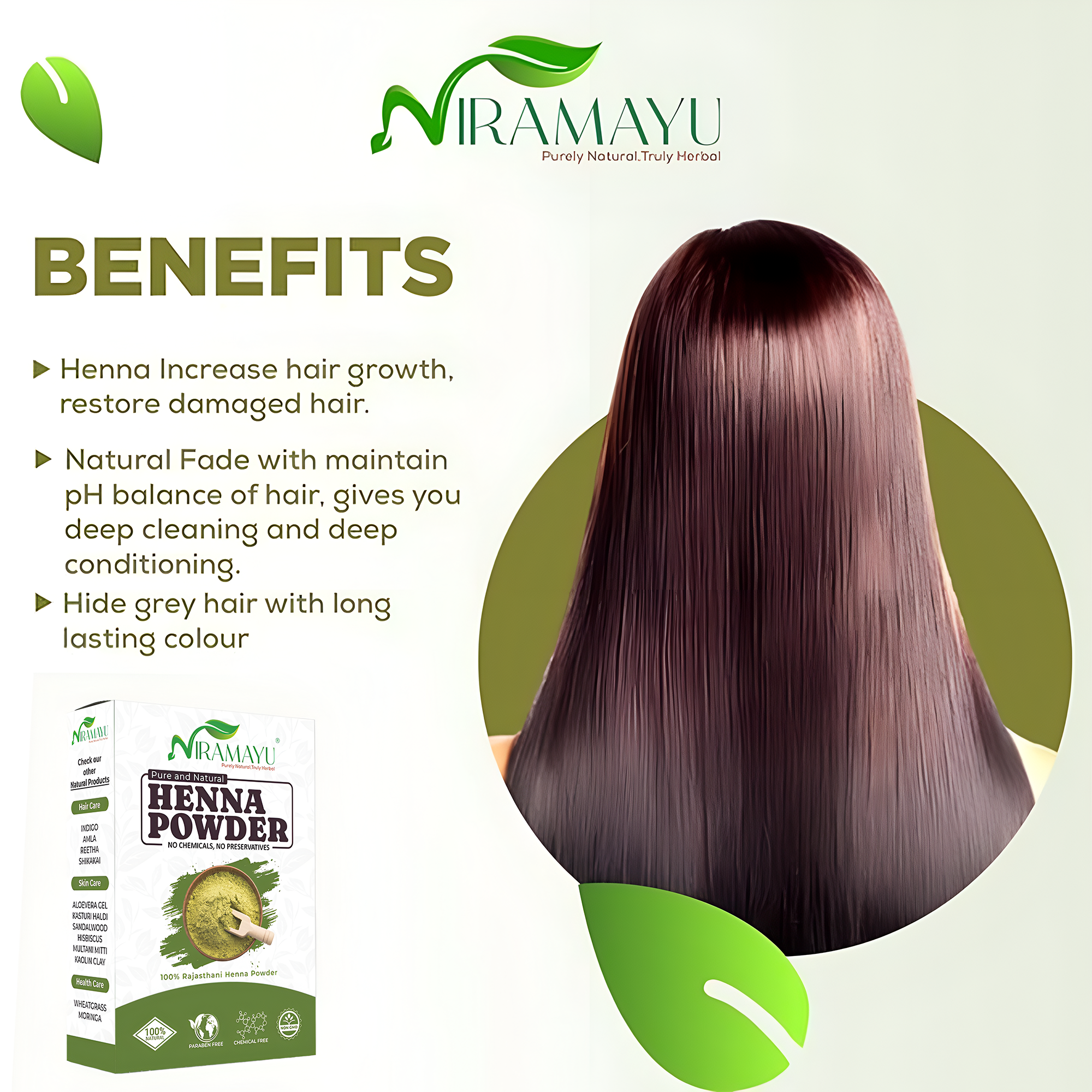 - Natural Rajasthani Henna: Niramayu Henna Powder is made from the finest organic henna leaves sourced from Rajasthan, India, offering an all-natural solution for hair coloring.