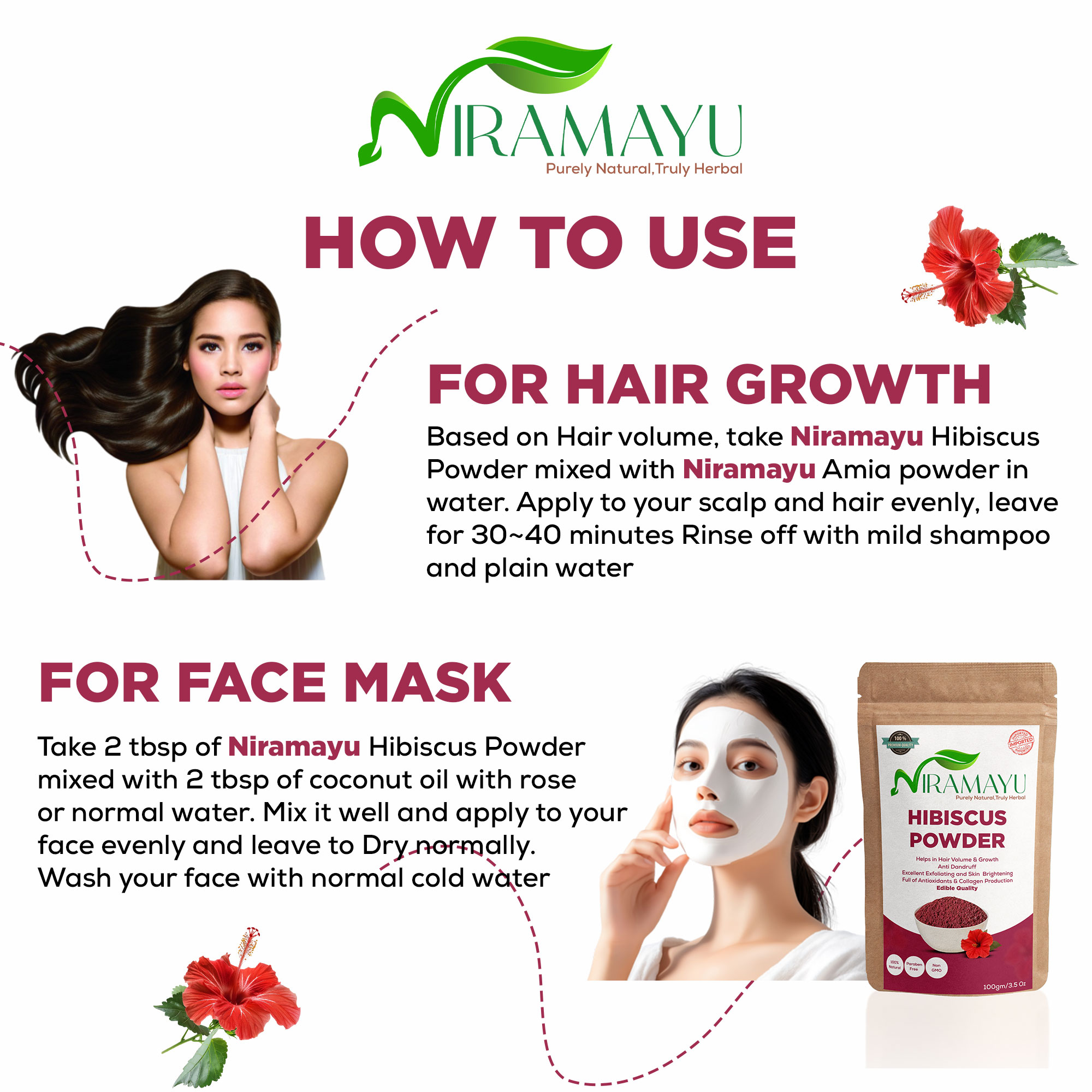 - ✅100% Pure & Natural: Niramayu Hibiscus Powder is made from freshly dried hibiscus flowers—free from chemicals, additives, or preservatives to ensure maximum purity and potency.